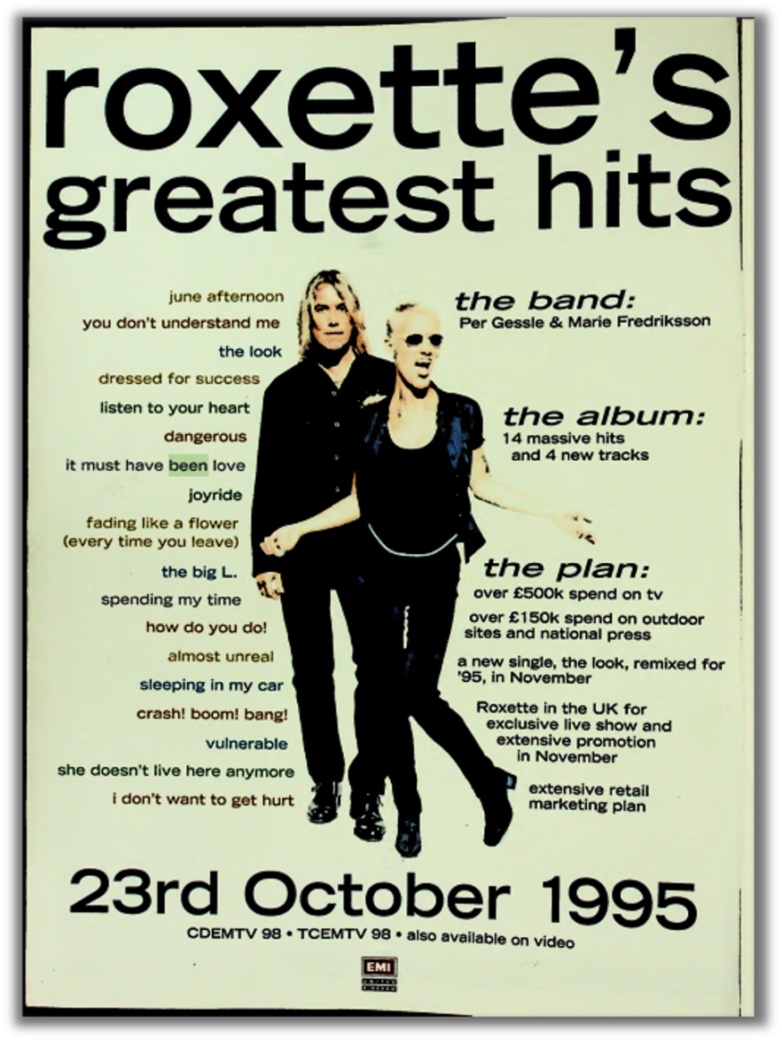 According to the full-page ad taken from Music Week Magazine UK at the time, over £500k was poured into TV advertising, with a further £150k committed to outdoor sites and national press. Retail marketing was extensive, a refreshed and new 1995 remix of ‘The Look’ was released as a single, and Roxette themselves were flown into the UK for an intensive run of TV promotion, interviews and performances.