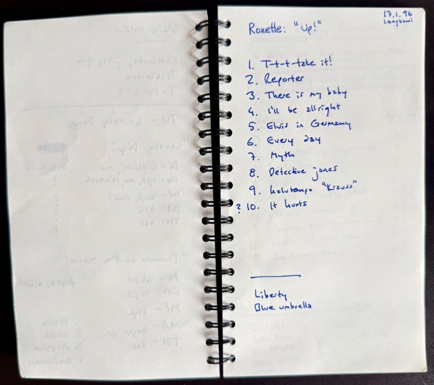 “Wow! Bumped into an old notebook and found this idea for a new Roxette album called ‘UP!‘ back in 1996. That, of course, never happened. Interesting choice of songs, don’t you think? Most of them wound up on ‘The World According To Gessle‘”. /PG 22 Feb 2026